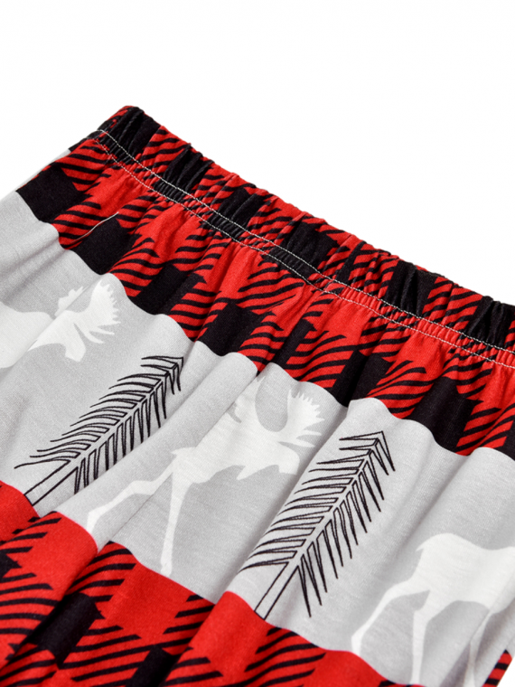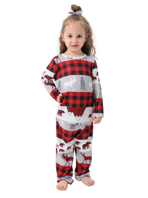 Ett vackert set med röd-, grå- och svartrutiga julpyjamasar för hela familjen, par, barn och bebisar. På denna modell hittar du björnar, granar och caribou-mönster för jul- och djurälskare.